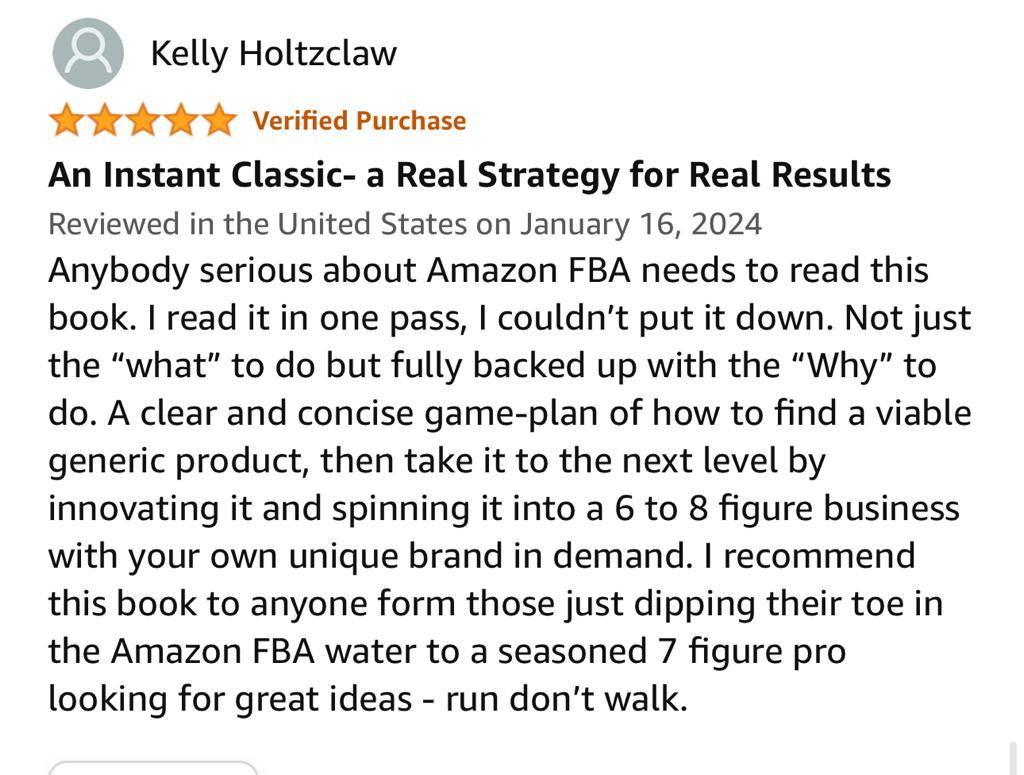 Definitely one of the best books about Amazon FBA and just by reading it, you can get an unfair advantage if you want to build a cash producing asset you can sell once you're ready to exit!